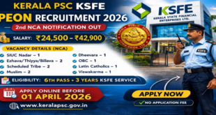 The Kerala Public Service Commission (Kerala PSC) has officially released the Second NCA Notification for the post of Peon / Watchman in Kerala State Financial Enterprises Limited (KSFE). This is an excellent opportunity for eligible candidates belonging to specified reservation categories to secure a stable government job in Kerala. Candidates …